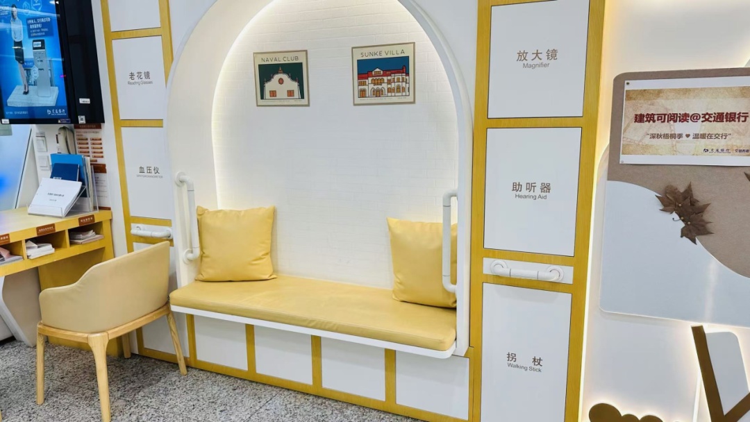 这是一家银行养老服务示范网点。一进门,她就感到这家网点有些不一样——“阿姨,您办什么业务?”“您这边先坐着休息一下。”银行工作人员说话轻声细语;墙上的储物格里,显眼地标识着助听器、拐杖、老花镜等助老设施;椅子高度也低了一些,方便老人就座。