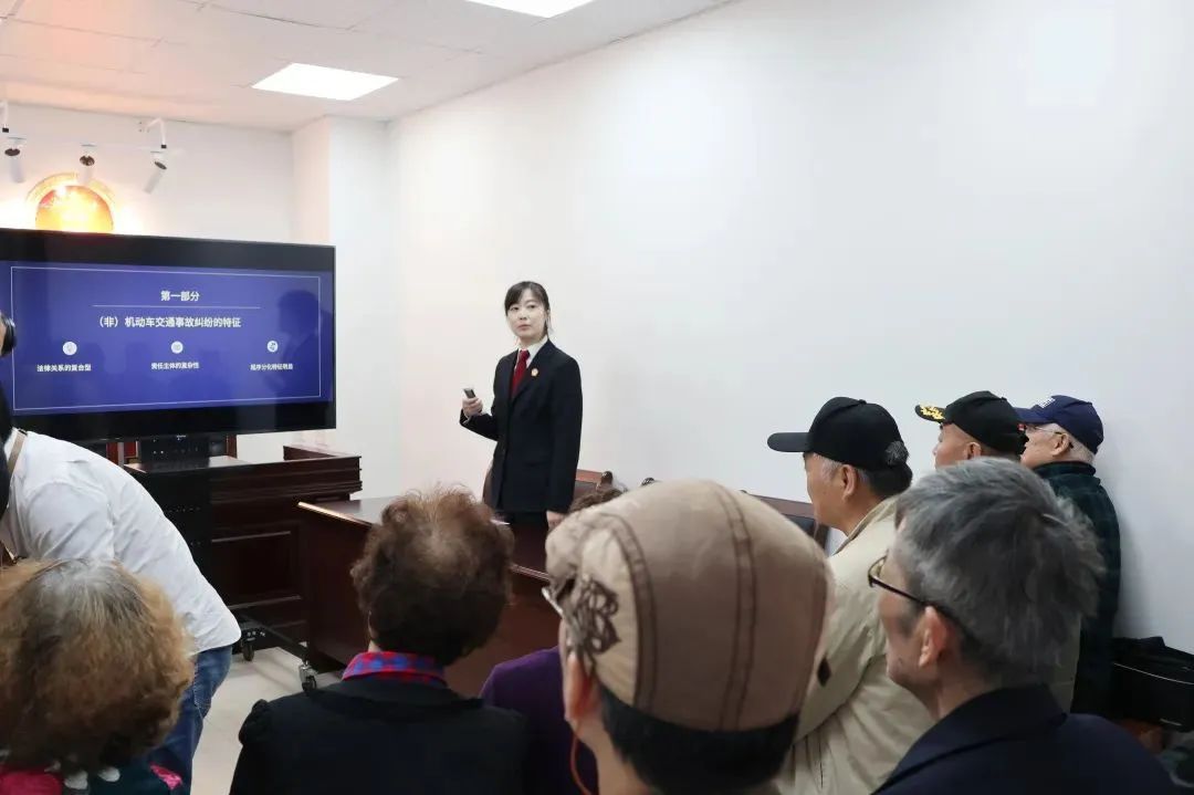 “打铁还需趁热”,为进一步扩大巡回审判辐射面、强化典型案例教育性,庭审结束后,承办法官“以案释法”,为现场旁听人员开展了一场主题为“(非)机动车交通事故纠纷调处要点”的培训,通过深入浅出的讲解与热烈的沟通互动,不仅向在场的居民代表普及了交通安全法律知识,达到了“审理一案、警示一方、教育一片”的效果。同时,承办法官向到场人员赠送了《“居委法苑”社区治理常见问题指引》,针对楼道杂物清理、“僵尸车”治理等社区常见问题提供法治化治理方案,为现场的司法所工作人员、民警及社工“充电”赋能,帮助他们在今后的工作更好地调处矛盾纠纷,推动基层治理提质增效。