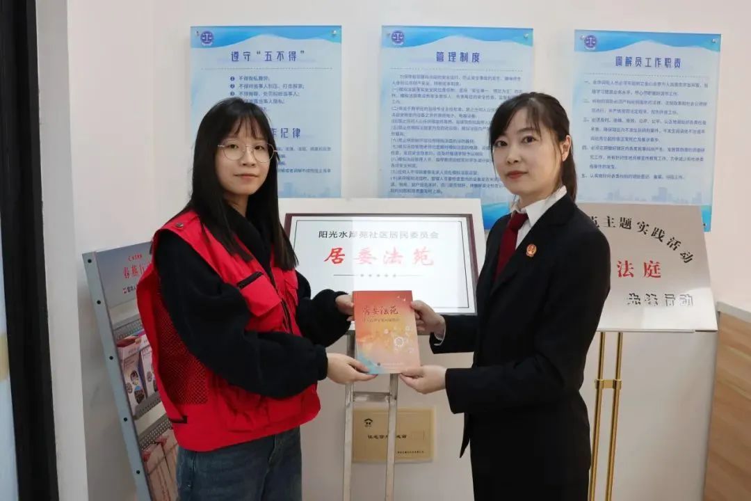 探索数“智”化治理,汇聚多元化赋能,打造“一站式”服务,桃浦镇阳光水岸苑居委法苑正带领居民们走上通向基层治理新格局的“幸福路”。作为上海2024年“美好社区 先锋行动”确定的100个市级项目之一,阳光水岸苑坚持减负和增能双向发力,依托“华普治理师”平台,与区委办局、镇职能科室积极对接共建,整合优势资源,着力打造“阳光365”党群服务站,优化“15分钟”社区生活圈,让居民的幸福感、获得感向前“大踏步”。在这座功能全面的党群服务站中,阳光水岸苑居委法苑“模拟法庭”正在基层“减负赋能”实践中发挥着莫大的作用,而其建立则与普陀区探索打造“靠谱解纷体系”的努力密不可分。