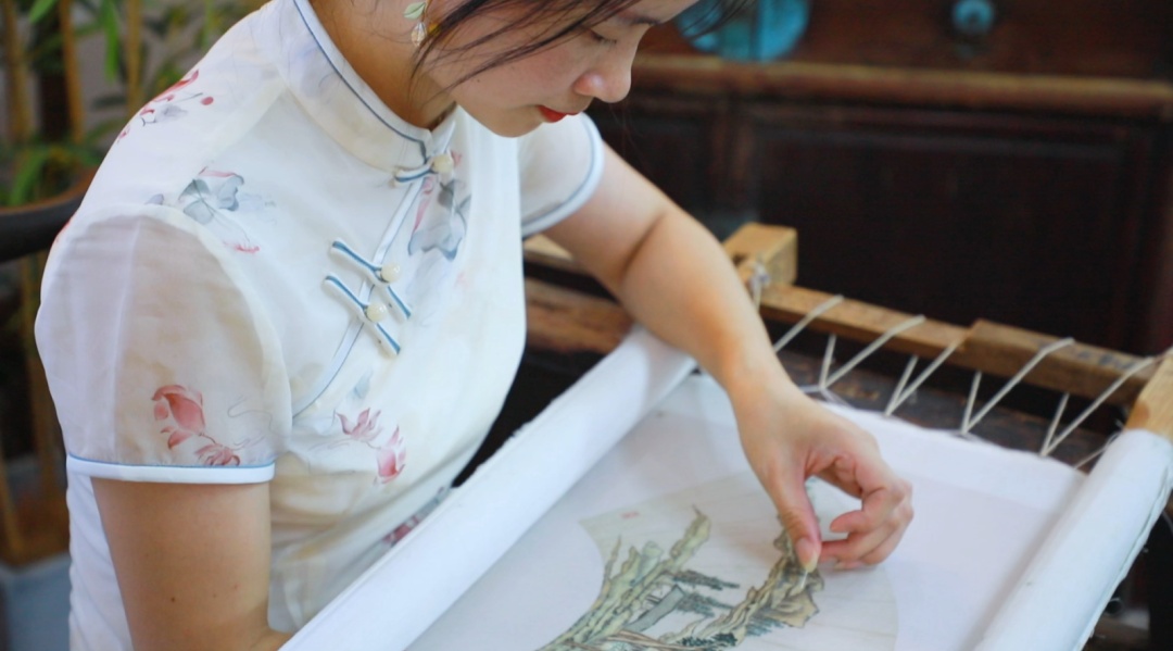 据悉,江南闺绣画是明清以来在嘉定及周边地区流传的传统美术形式,专由闺阁女子以桑蚕丝绣绘文人书画。闺绣画可上溯至北宋,宋徽宗在皇家画院设绣画专科,开启以传统书画为底稿的绣绘艺术,后来渗透到富贵望族和闺阁绣房,对江南地区影响很大。