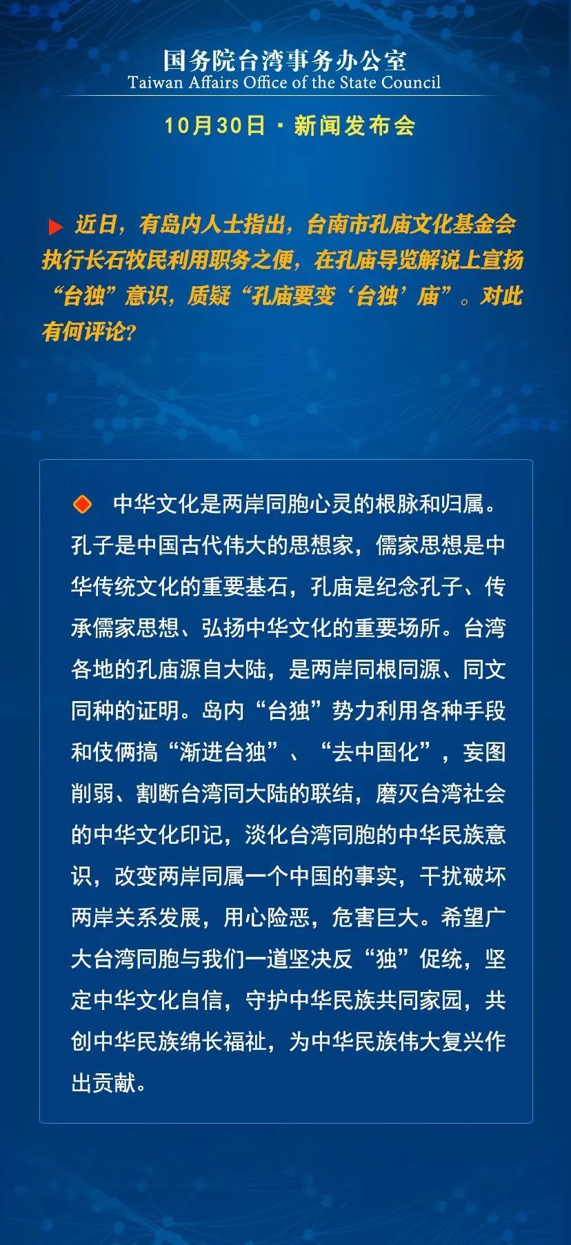 国台办:“台独”分裂行径和外来干涉动摇不了我们解决台湾问题的决心意志