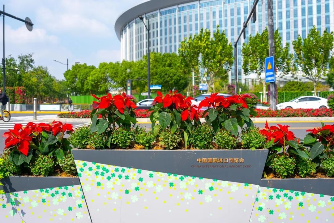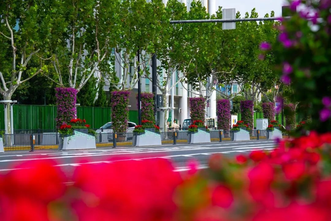 在城市景观造型方面,与之前相比,这次进博会在植物选择和景观设置上进行了创新与优化。在植物的选择上,更加注重生态可持续性和气候适应性。注重耐旱、抗病虫害等适应性的改进,选择适应上海气候变化趋势的植物品种,如矾根、火焰南天竹等,减少因气候影响带来的景观破坏,降低景观的维护成本和环境影响。在景观设置上,更加注重增强互动性和观赏性。比如在诸光路景观绿墙上,设置芦苇造型氛围灯和蝴蝶造型灯,通过光影的变化,模拟自然景观,增强花墙的立体感和层次感。