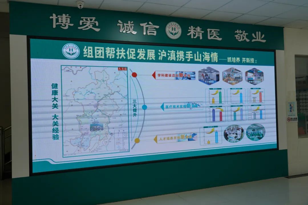 在大关县人民医院,代表团察看了闵行区“组团式”医疗对口支援大关县医疗卫生事业的实践做法和工作进展。2023年,在中央党校的推动下,新增派上海交通大学医学院附属仁济医院、上海市第五人民医院、闵行区中心医院、昆明医科大学第一附属医院等4家医院15名医生进驻开展“组团式”医疗帮扶,其中闵行派出5位医生。