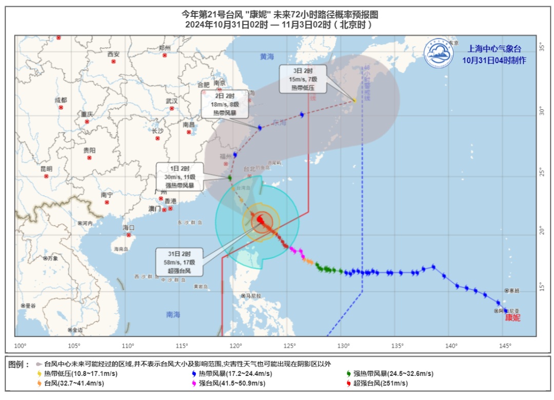 崇明区气象台2024年10月31日09时00分发布台风蓝色预警信号:受今年第21号台风“康妮”和冷空气共同影响,预计31日夜里至11月2日早晨本区将出现陆地阵风8-9级,长江口区阵风9-10级,请注意防范台风对高空作业、水陆交通、设施农业等的不利影响。