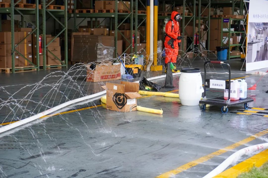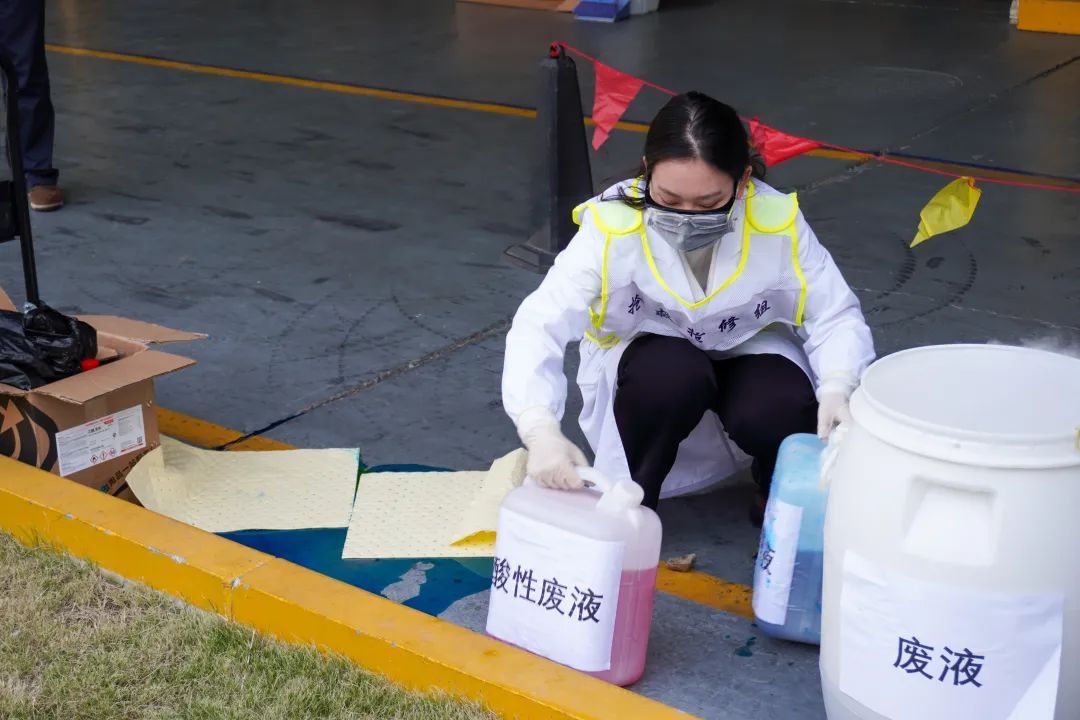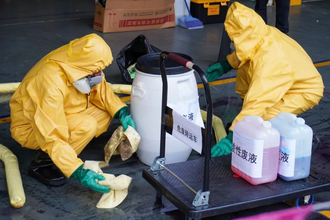 梅特勒托利多是全球领先的精密仪器及衡器制造商和服务商,产品适用于实验室、制造业和零售服务业,在日常生产与作业中经常涉及各类实验操作。在演练中,模拟了两名实验室操作人员在进行实验时,一人不慎将化学酸性废液倒入废液收集桶,引发火情并导致废液飞溅伤人的情景。企业EHS部门(即企业内复杂环境、健康、安全的部门)迅速响应,封锁现场、救治伤员、扑灭火情,并对洒落的废液进行危废处理。