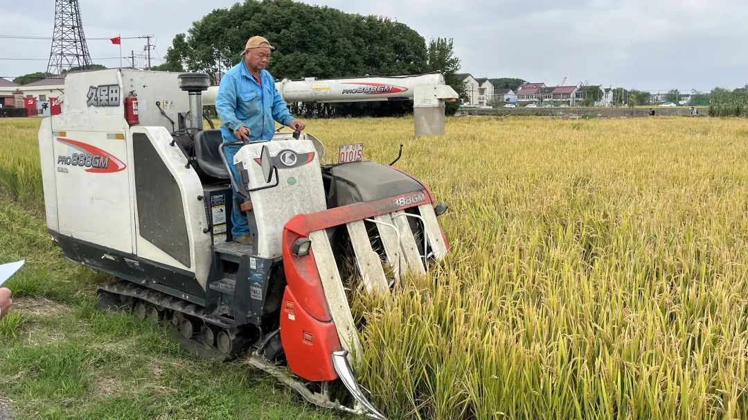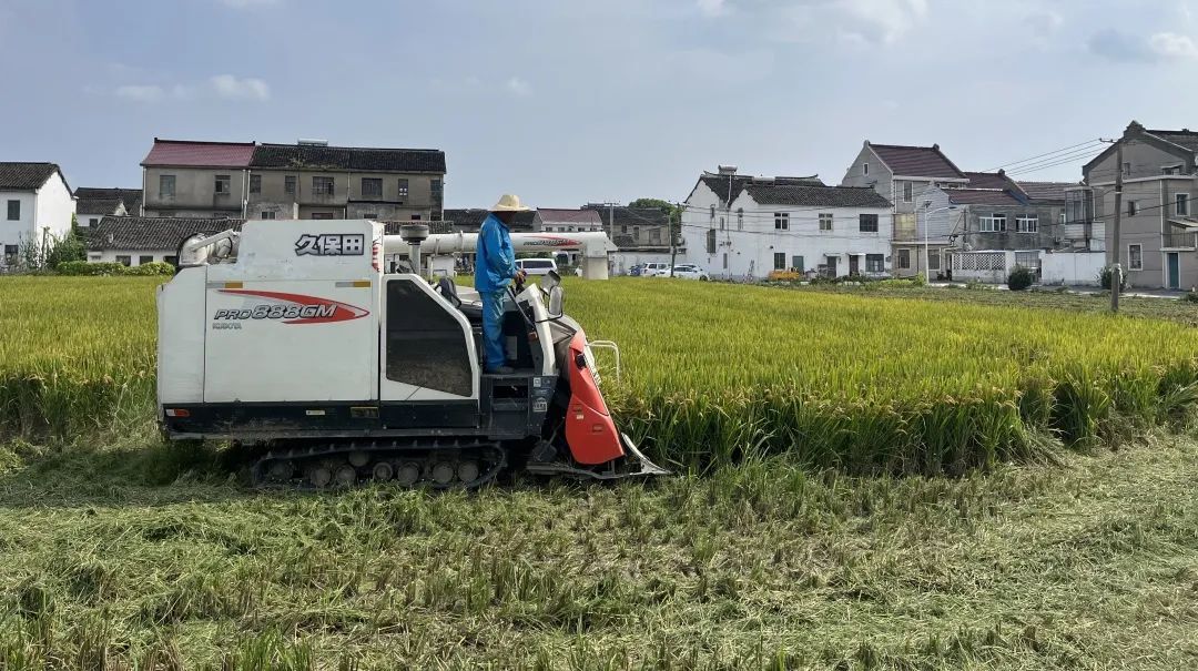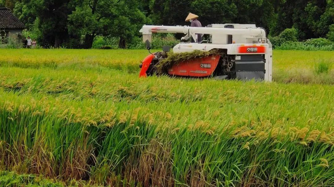 只见一台台收割机在稻浪穿梭