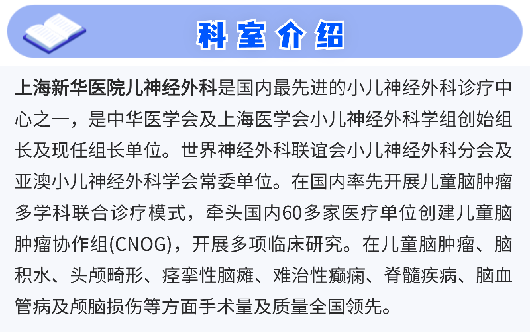 上海交通大学医学院附属新华医院儿神经外科是国家临床重点专科,也是目前全国规模最大的小儿神经外科中心。