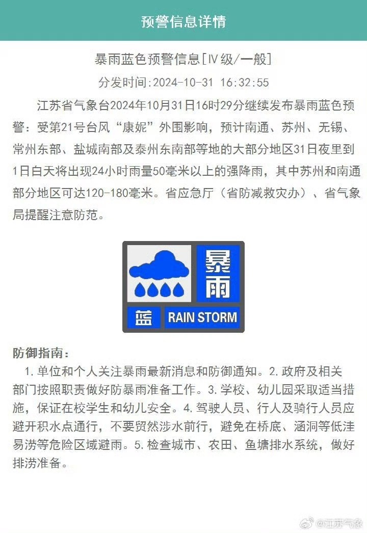 交汇点讯 10月31日16时29分,江苏省气象台继续发布暴雨蓝色预警:受第21号台风“康妮”外围影响,预计南通、苏州、无锡、常州东部、盐城南部及泰州东南部等地的大部分地区31日夜里到1日白天将出现24小时雨量50毫米以上的强降雨,其中苏州和南通部分地区可达120到180毫米。省应急厅、省气象局提醒注意防范。