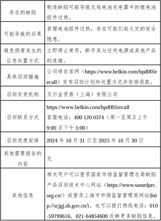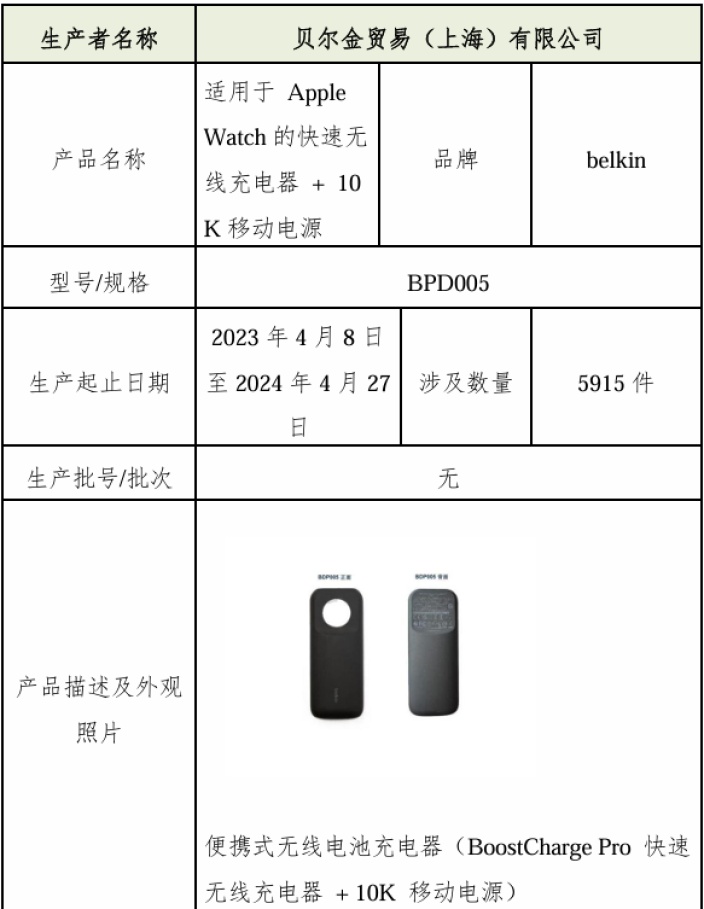 市市场监管局介绍,贝尔金贸易(上海)有限公司自2024年10月31日至2025年10月30日召回2023年4月8日至2024年4月27日生产的belkin牌适用于Apple Watch的快速无线充电器+10K移动电源,共计5915件。详见↓