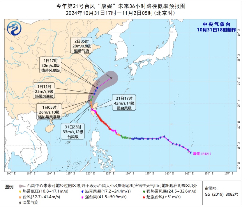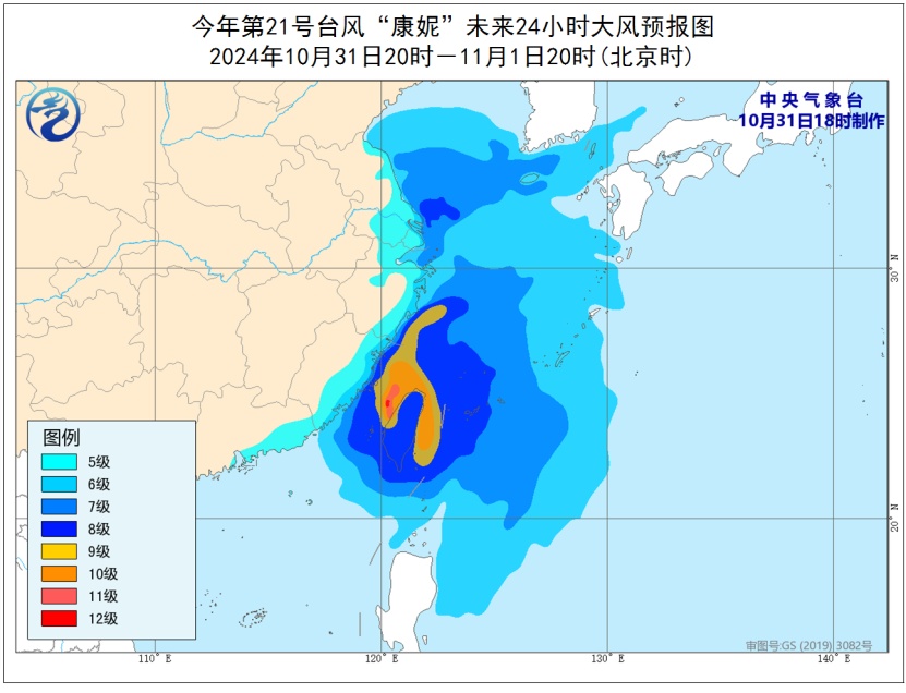 10月31日20时至11月1日20时,受冷空气和“康妮”的共同影响,黄海南部、东海大部及钓鱼岛附近海域、台湾海峡、台湾以东洋面、巴士海峡、南海东北部、江苏沿海、浙江沿海、福建沿海、台湾岛及沿海将有6-8级大风,阵风9-10级;其中台湾海峡、台湾以东洋面和东海南部的部分海域、台湾岛沿海、福建中北部沿海的风力有9-10级,阵风11-12级,台风中心经过的附近海面和地区风力有11-13级,阵风14-15级。