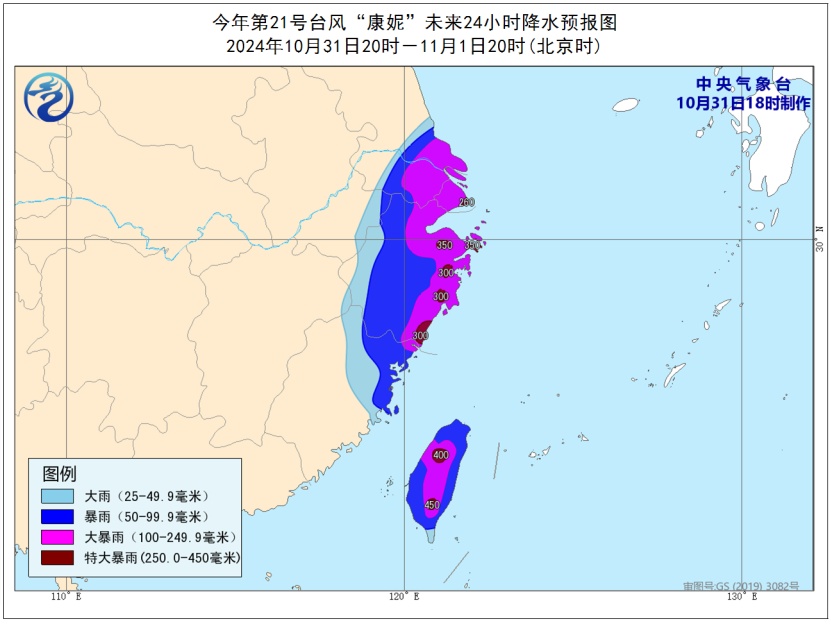 10月31日20时至11月1日20时,福建东北部、浙江中东部、上海、江苏南部、台湾岛等地有暴雨或大暴雨,其中,浙江东部、上海东南部、台湾岛等地局地有特大暴雨(250-450毫米)。与历史同期相比,上述地区降水具有极端性。
