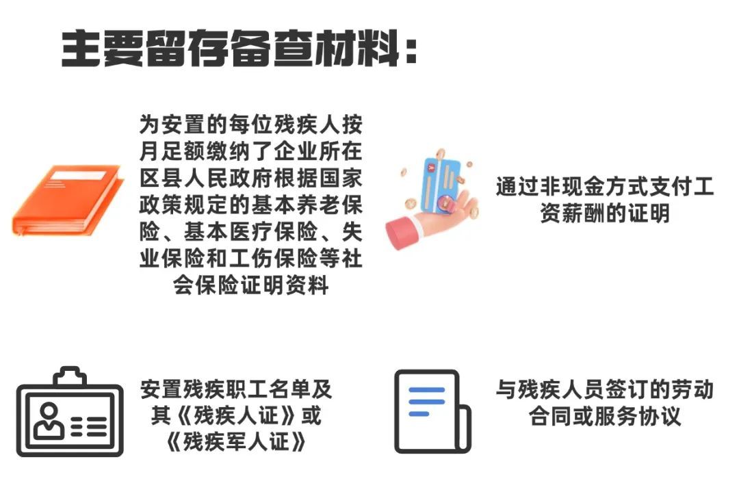 1.为安置的每位残疾人按月足额缴纳了企业所在区县人民政府根据国家政策规定的基本养老保险、基本医疗保险、失业保险和工伤保险等社会保险证明资料;