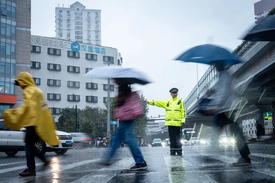“请注意积水路段,减速慢行!”杨吉的声音透过雨幕传来。尽管雨水打湿了制服,他依然坚持用清晰的手势指挥着来往的交通,确保车流有序通行,同时提醒市民群众注意出行安全。