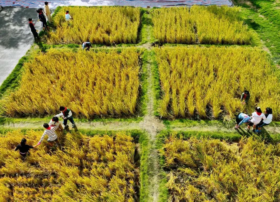 4个月后,学生们再次踏入了稻田,在老师的指导下,左手抓稻秆,右手挥镰刀,手起刀落间,将一捆捆稻谷割下,堆成了一个个金黄色的“小山丘”。