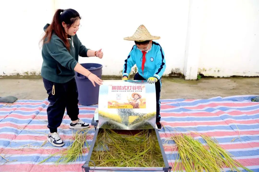 最后,大家还围着看老师用“碾米机”进行脱稻,当一粒粒黄色的稻谷终于变成了平日熟悉的白色米粒,实现了稻谷到大米的完美蜕变后,大家都高兴极了。