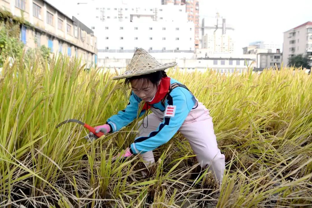 10月30日上午,学生们戴上草帽、拿起镰刀,离开教室、走进稻田,亲身体验收割稻子的全过程,用心感受“粒粒皆辛苦”的辛劳与收获。