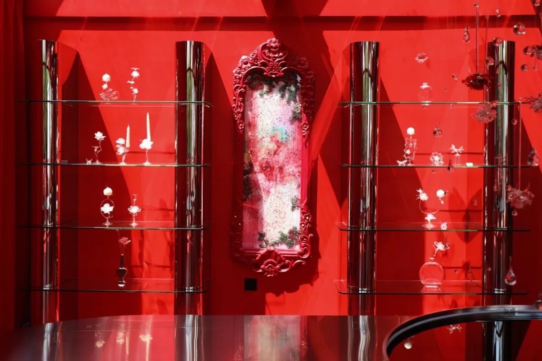 全红色背景和精致的玻璃雕塑