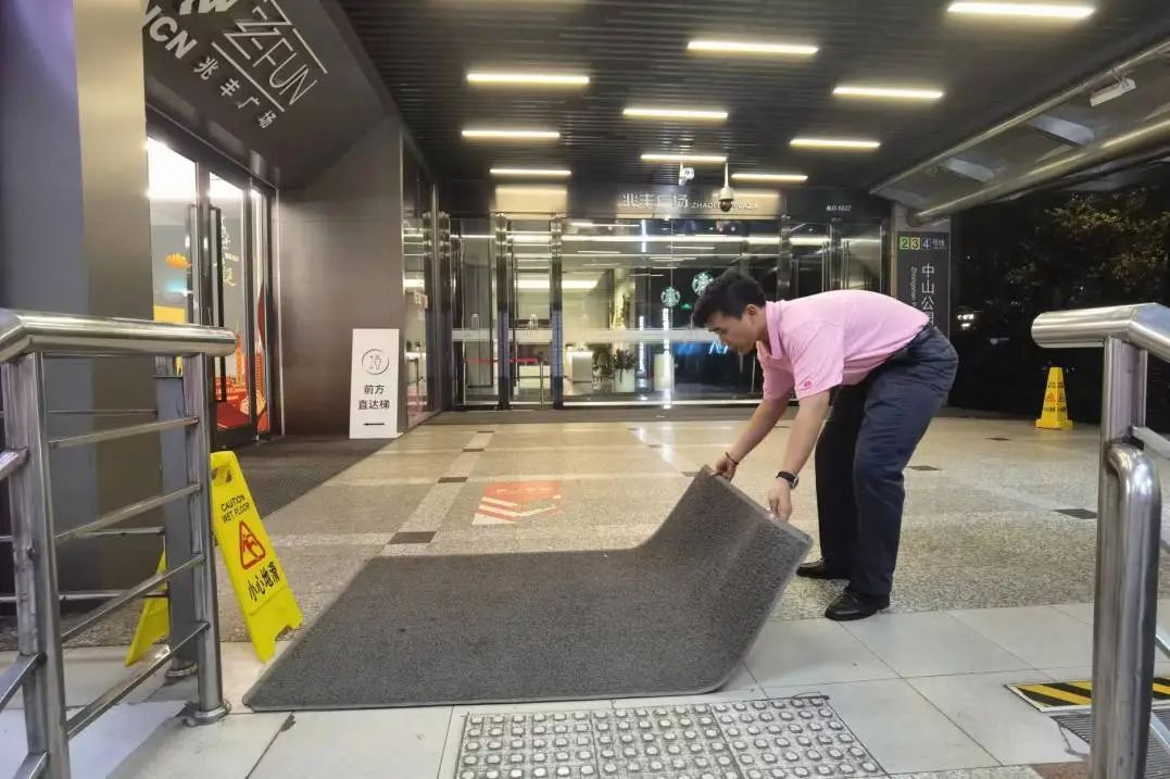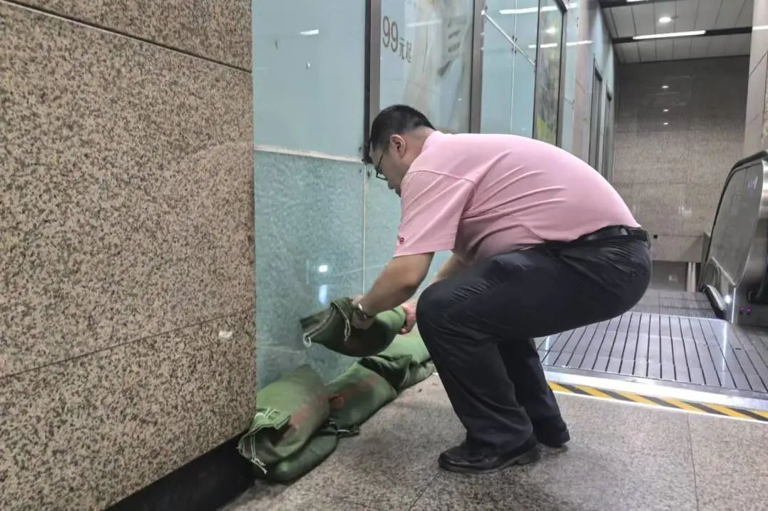 随着风势雨势增大,昨夜今晨,车站对防汛防台设备进行全程监控,在可能会造成雨水倒灌和渗漏的点位摆放了防汛沙袋,并铺设了防滑毯,摆放了“小心地滑”的警示牌。夜间加强站厅、站台及出入口巡视频次,运营开始前工作人员提前对各出入口进行了再次全面巡视,尤其是出入口平台处的地面积水第一时间进行了清理,并采取相应防滑措施,同时安排工作人员在出入口引导提醒乘客注意安全。