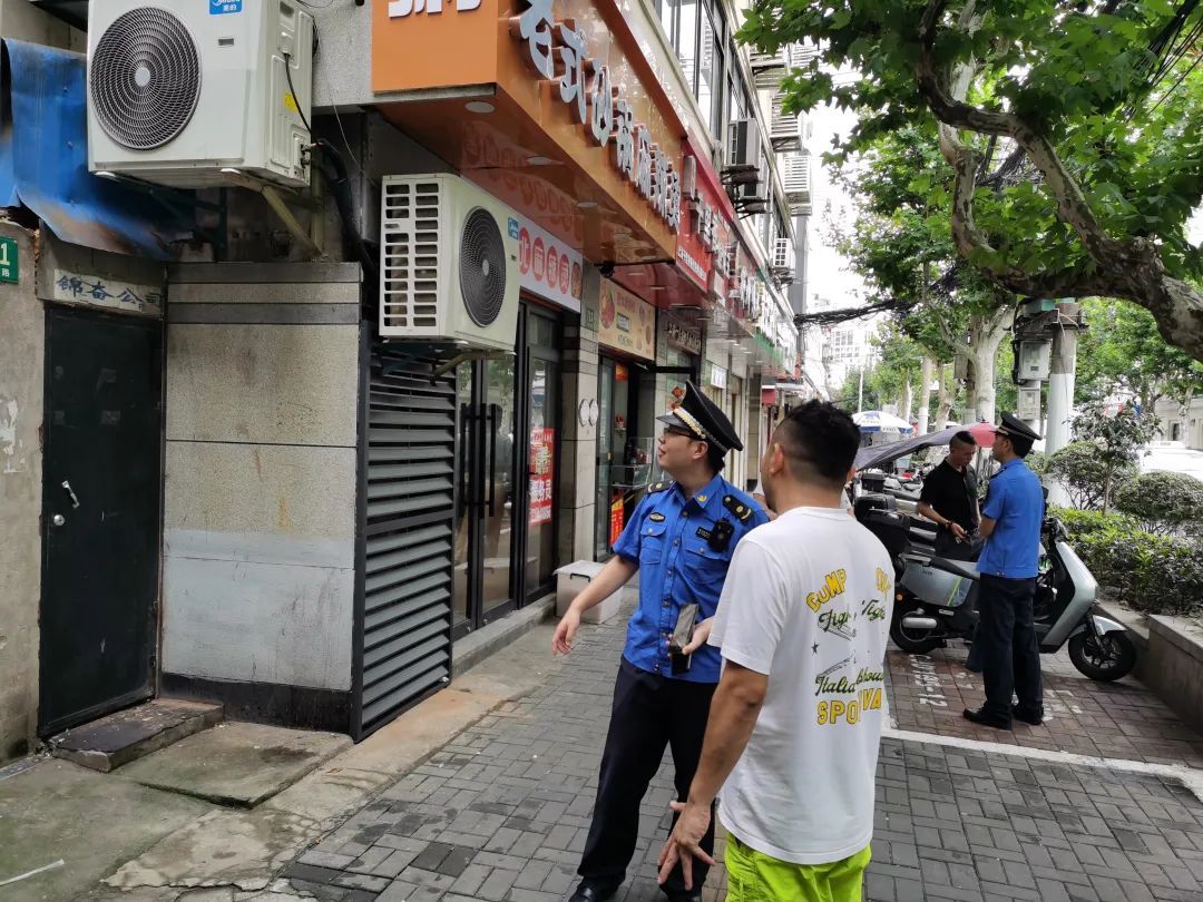 执法人员联合多方力量,对辖区主要道路、沿街商铺、菜市场、重要商圈周边进行检查,排除排查广告、店招和空调等户外设施相关安全隐患,整治占道堆物、跨门营业、非机动车乱停放等影响道路安全畅通行为,督查沿街商户履行市容环卫责任,确保店前人行道路整洁。检查发现,万航渡路上一家商户违规安装空调外机,挤占人行通道,安装位置过低,安全隐患较大,执法人员及时督促当事人改正。近两周以来,执法人员共教育警告跨门经营行为5起,清理占道堆物2处,排除户外设施安全隐患2处,劝阻设摊卖小百货行为1起。