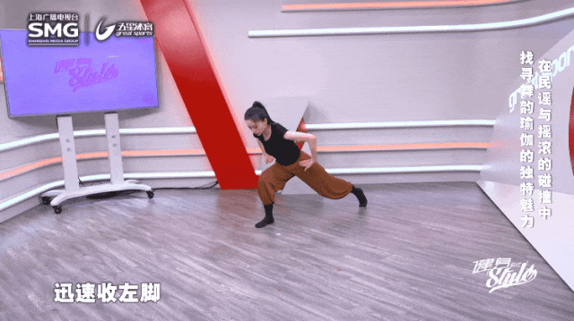 左右腿两次发力弹跳,右脚落地,左脚向后支撑;