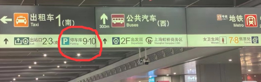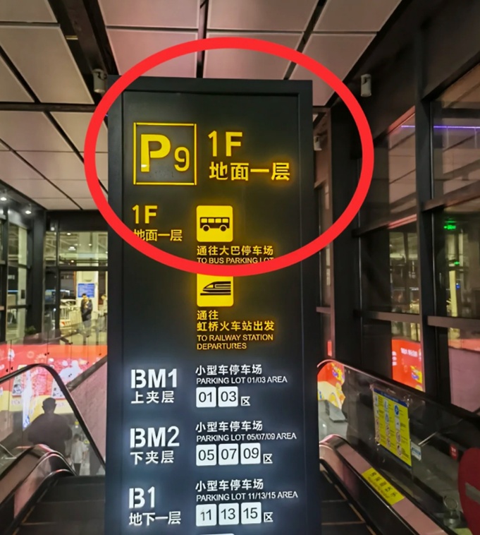从便利店向北看(出虹桥站往西的旅客往右看),您将看到停车库P9的指引。此时,您已到达P9的B1层入口处。