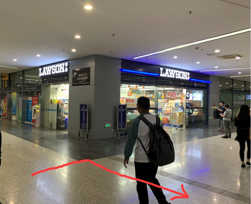 沿着虹桥综合交通枢纽西侧的B1地下大通道向西走,直至到达虹桥长途客运西站,然后向北转(人走的方向为往右)。您会看到一家蓝色标识的著名便利店。