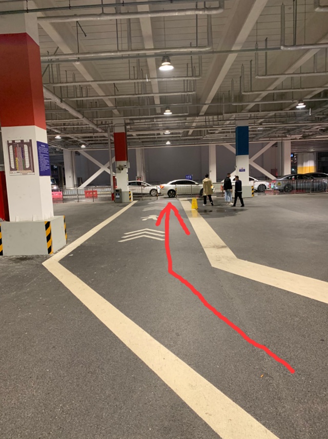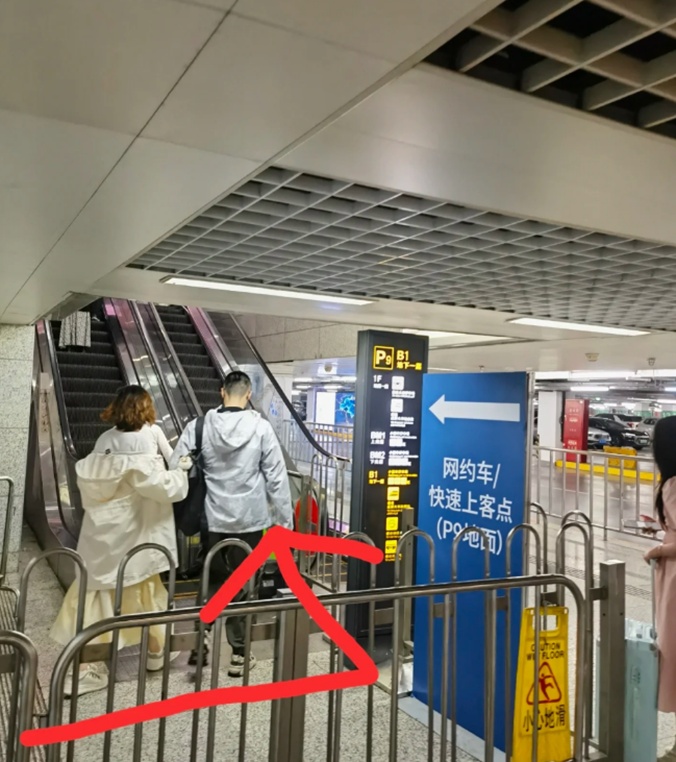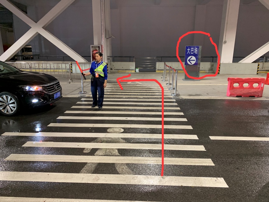沿着地面人行指引,穿过网约车P9地面(1F)上客点,有网约车通行,注意往来车辆。