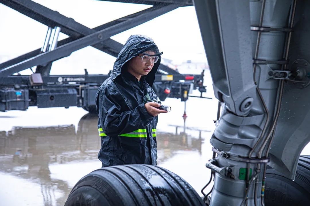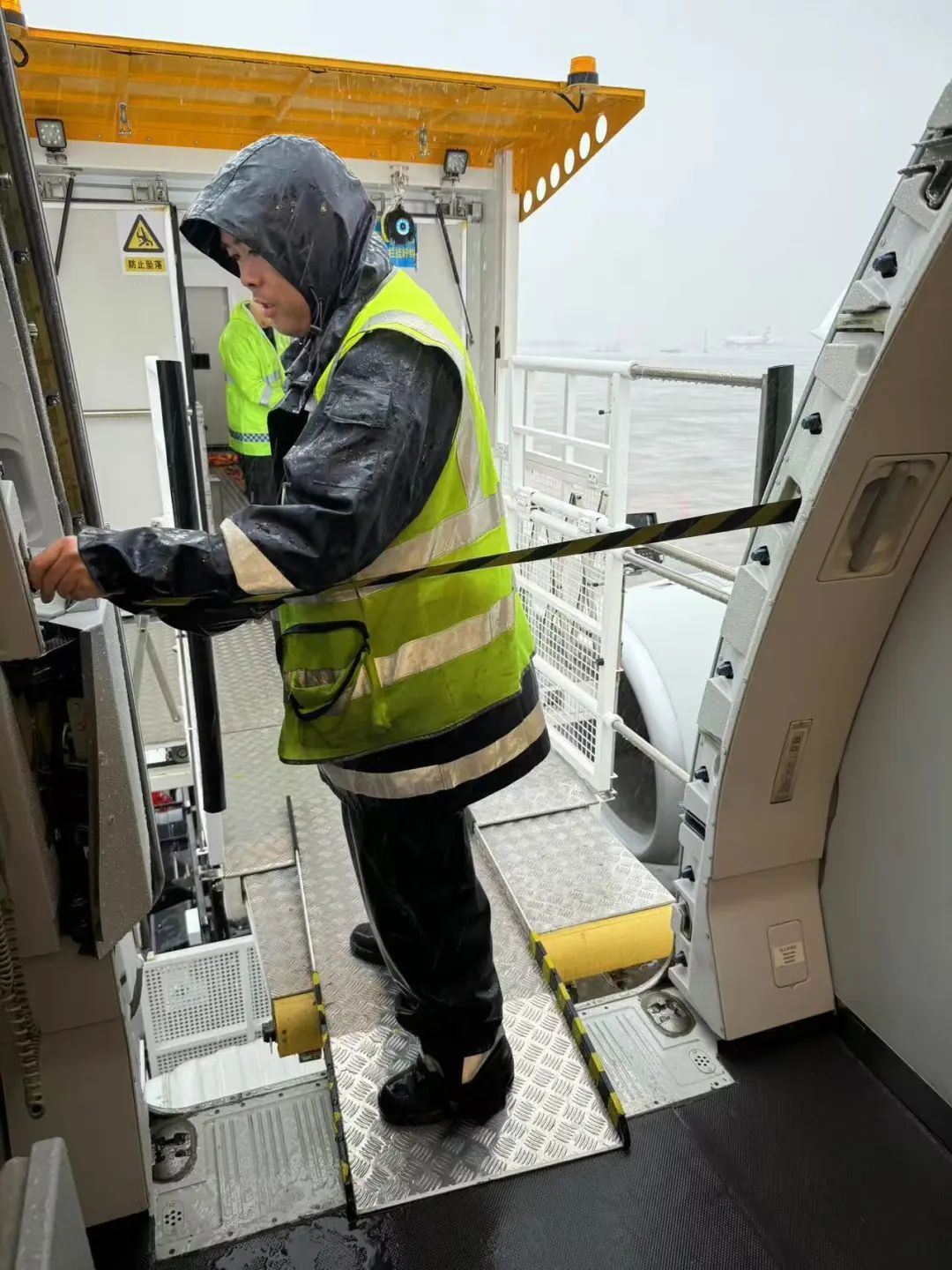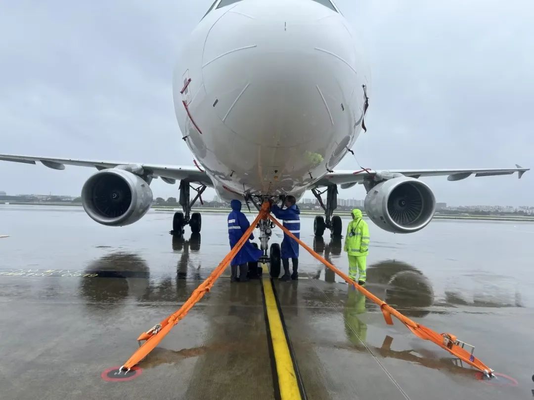 在宁波栎社国际机场,东航机务工程师在台风来临前夕用安全绳系留飞机。