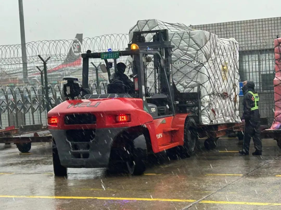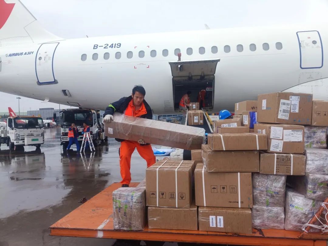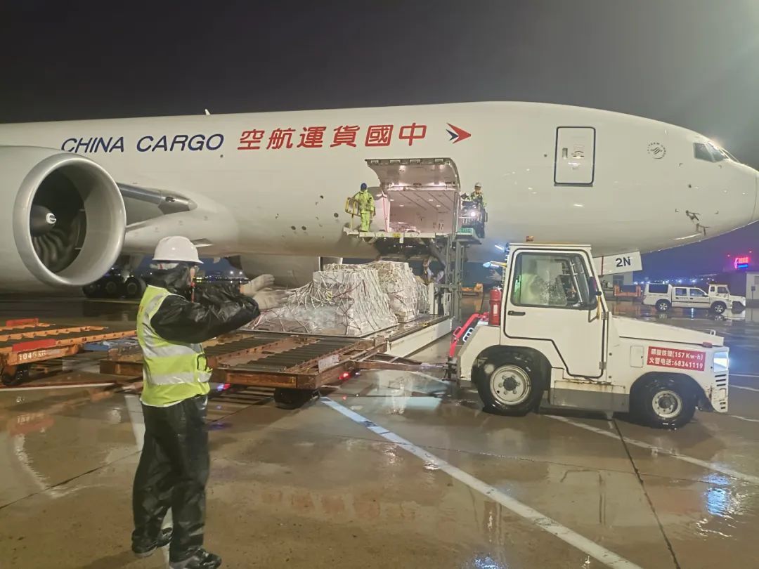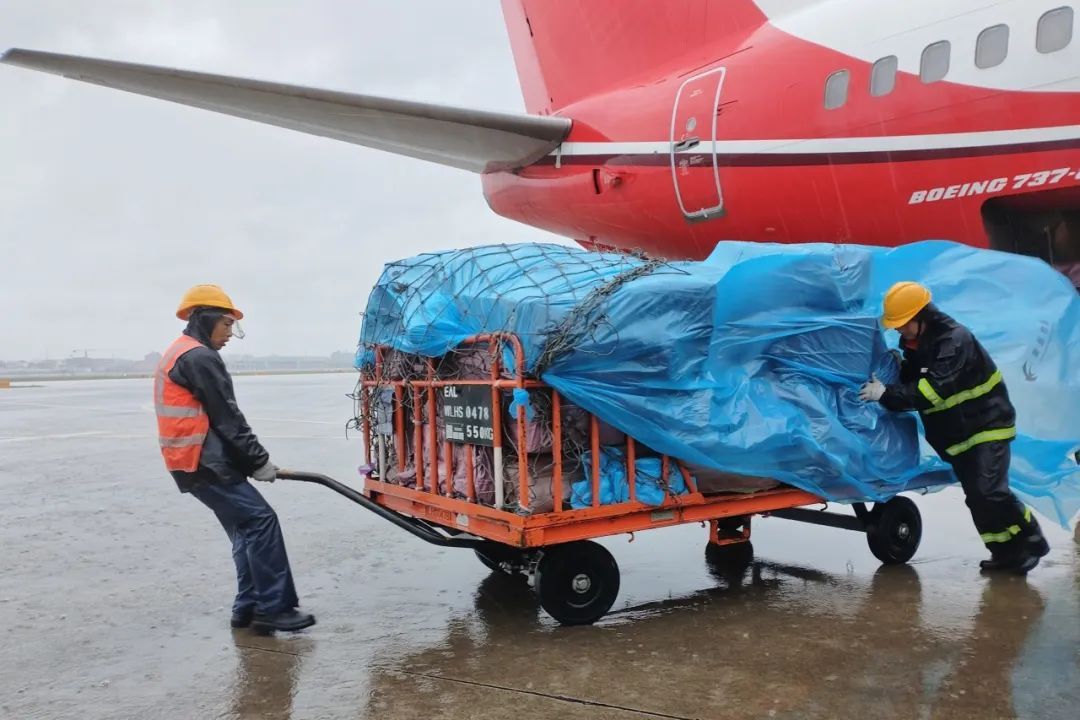 10月31日晚间,东航物流员工冒雨进行装卸作业。