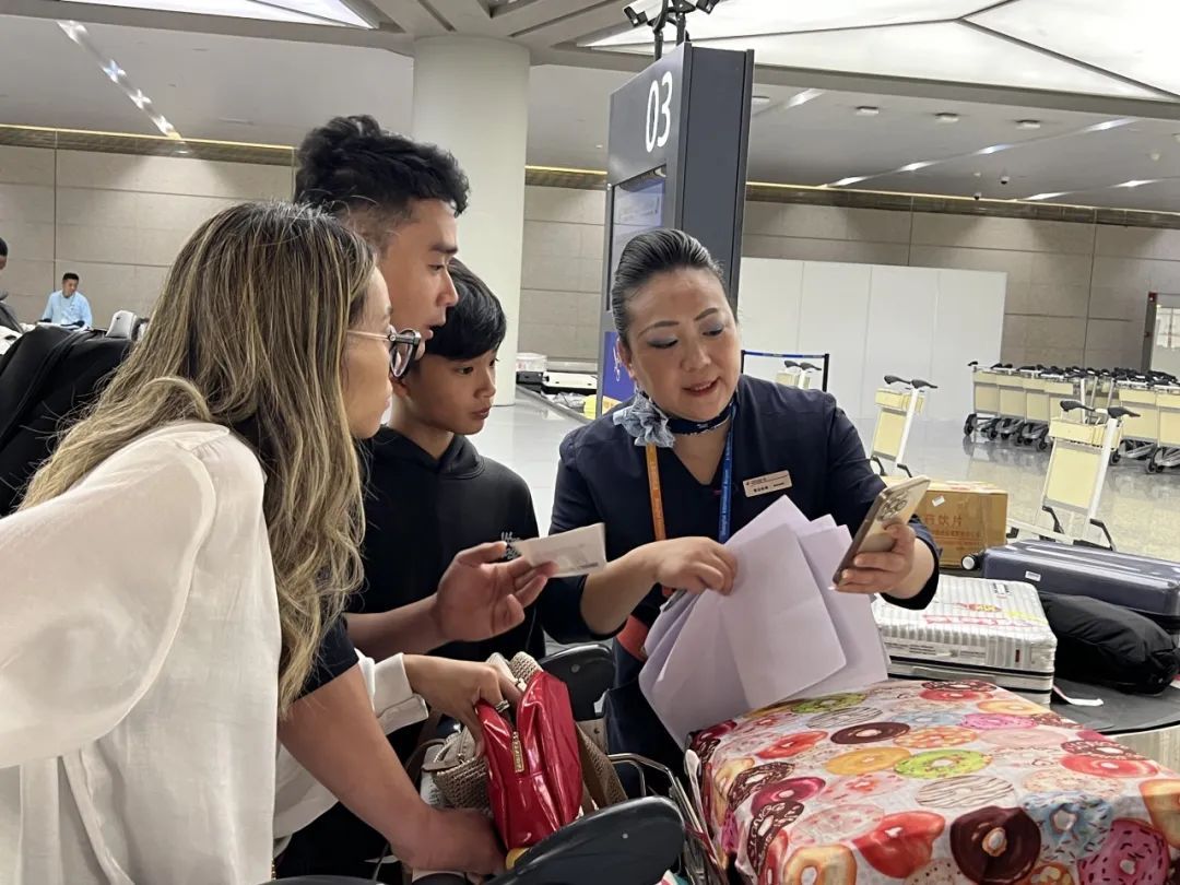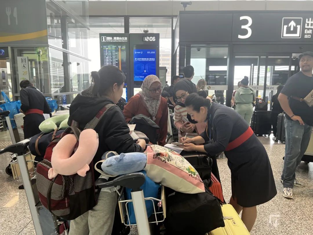 在机场候机楼内,东航员工积极协助旅客做好台风天航班退改签工作。