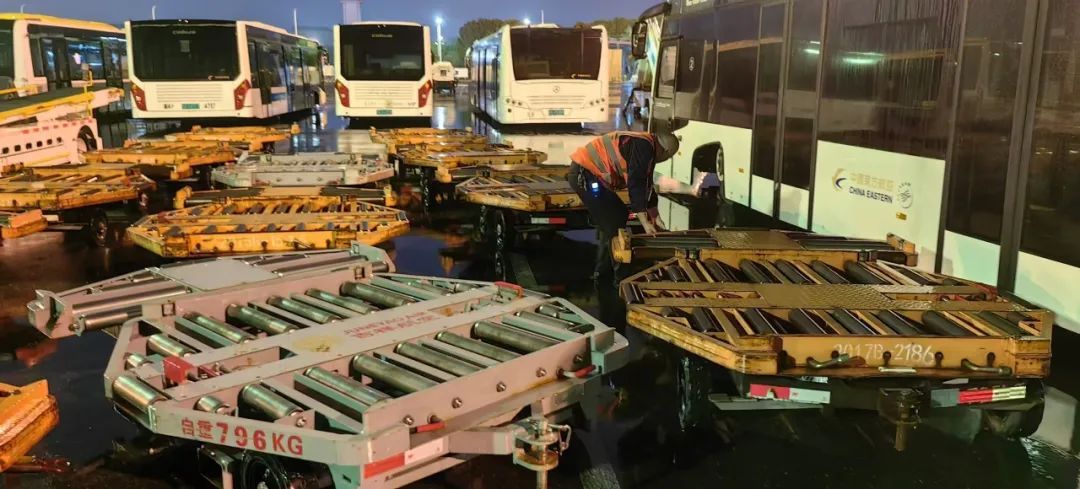 10月31日晚间,在台风康妮来临前夕,东航地服人员正抓紧系留、固定航后行李车、行李转盘车等地面无动力设备。