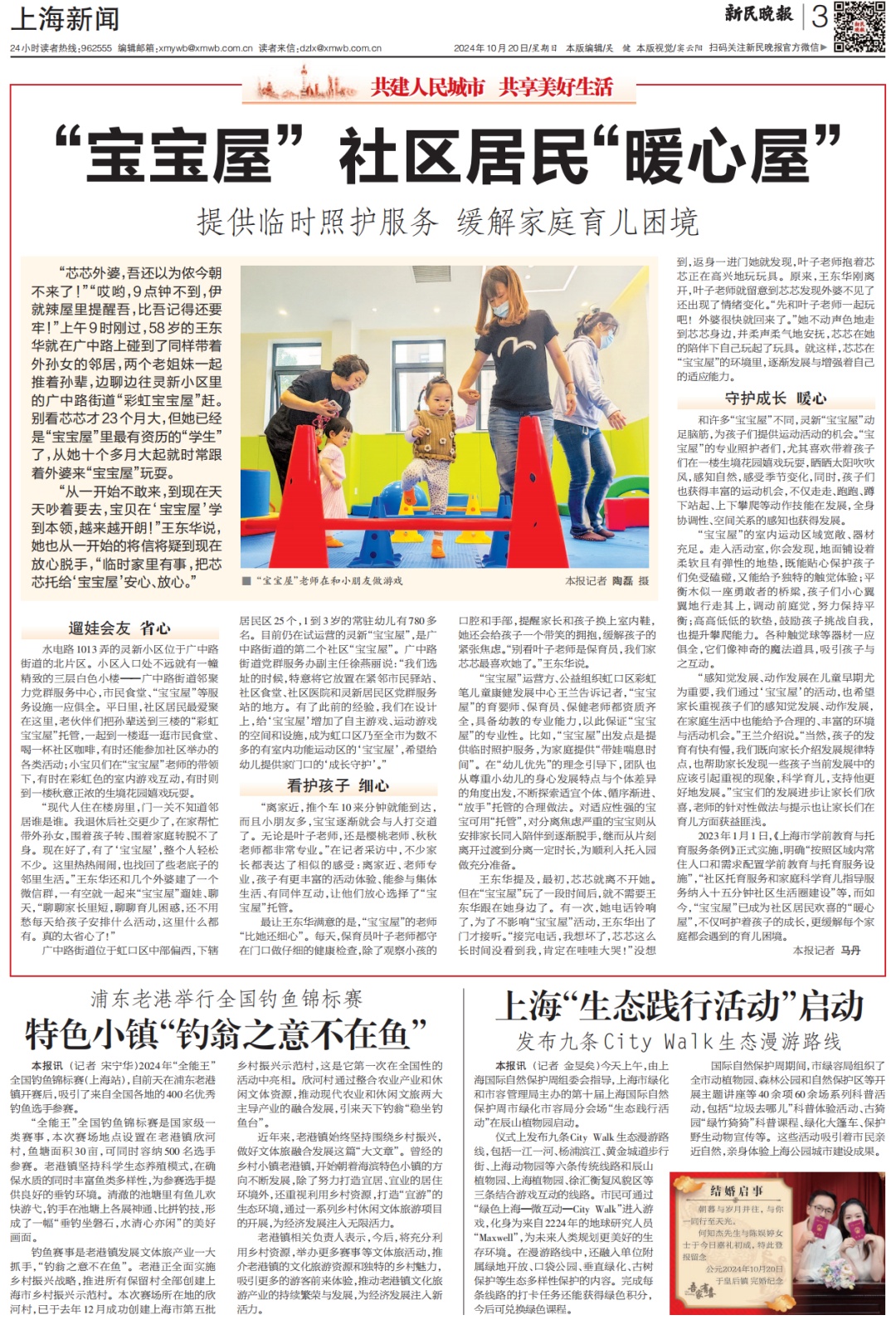“现代人住在楼房里,门一关不知道邻居谁是谁。我退休后社交更少了,在家帮忙带外孙女,围着孩子转、围着家庭转脱不了身。现在好了,有了‘宝宝屋’整个人轻松不少。这里热热闹闹,也找回了些老底子的邻里生活。”王东华还和几个外婆建了一个微信群,一有空就一起来“宝宝屋”遛娃、聊天。“聊聊家长里短,聊聊育儿困惑,还不用愁每天给孩子安排什么活动,这里什么都有。真的太省心了!”