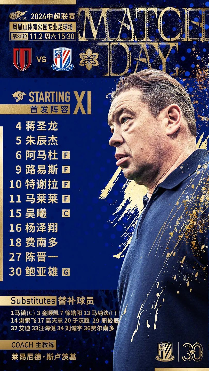 30-鲍亚雄、4-蒋圣龙、5-朱辰杰、16-杨泽翔、27-陈晋一、6-阿马杜(F)、10-特谢拉(F)、15-吴曦、9-安德烈-路易斯(F)、11-马莱莱(F)、18-费南多