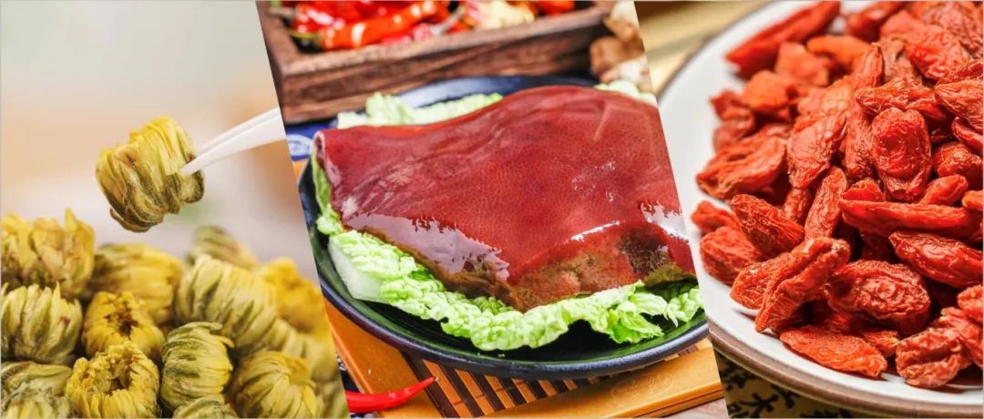 菊花味辛、甘、苦,性微寒,其气味芬芳,能疏散风热、平抑肝阳;枸杞味甘、性平,能滋补肝肾、益精明目;猪肝味甘、苦,性温,能补肝、明目、养血。