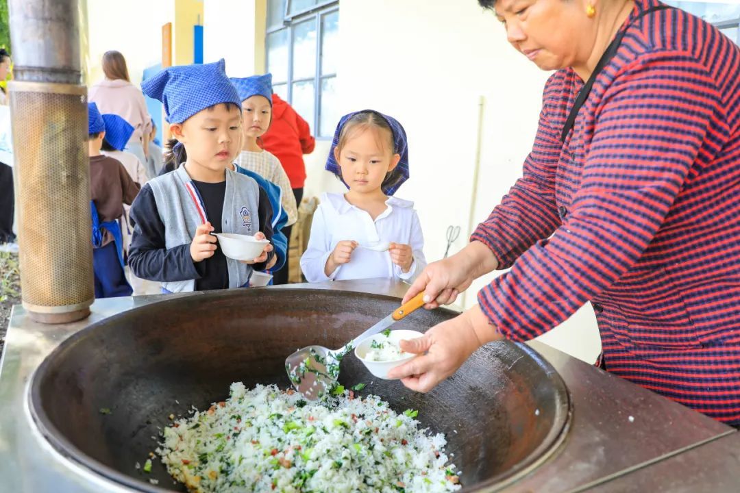 捡拾稻穗后,就来到了孩子们最期待的柴火饭烹饪活动。在老师们的指导下,孩子们又化身小小厨师,你添柴、我翻炒,每一个步骤都充满了探索与乐趣。当一锅香气四溢的饭菜新鲜出炉时,孩子们品尝着自己亲手制作的美食,脸上难掩那份满足与自豪。