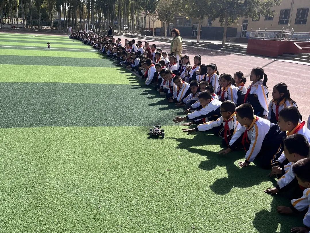 前几日,在新疆喀什的泽普县第六中学的运动场上,来自上海市虹口区青少年活动中心的科技教师张颉贇、陈立涛正在向现场800多名学生进行机器狗、遥控车的展示。