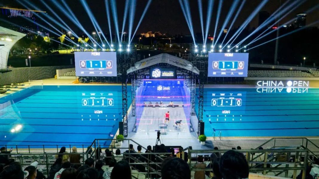 据悉,为了迎接这场顶级国际职业赛事,赛会发扬顶级壁球赛事与城市景观紧密结合的特色,将比赛地点设置在上海地标性场馆——浦发银行东方体育中心的“月亮湾”。值得一提的是,在国际职业壁球协会(PSA)旗下的巡回赛中,这是首次有赛事选择泳池作为背景。组委会在此设计了4片符合国际顶级赛事标准的玻璃球场,在不到半个月的时间就完成高质量搭建。其中中央球场搭建在“月亮湾”的泳池中间,晶莹剔透如同水晶宫,与“月亮湾”荡漾的碧波以及浦江两岸的城市轮廓融为一体,展示了上海充满活力的城市形象。