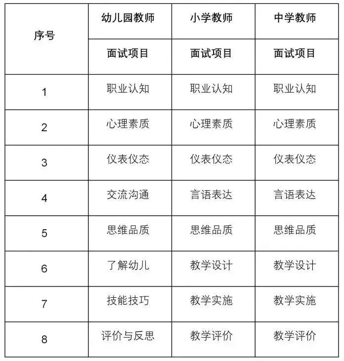 各学段教师资格考试面试项目具体如下(中职教师面试项目同中学教师):