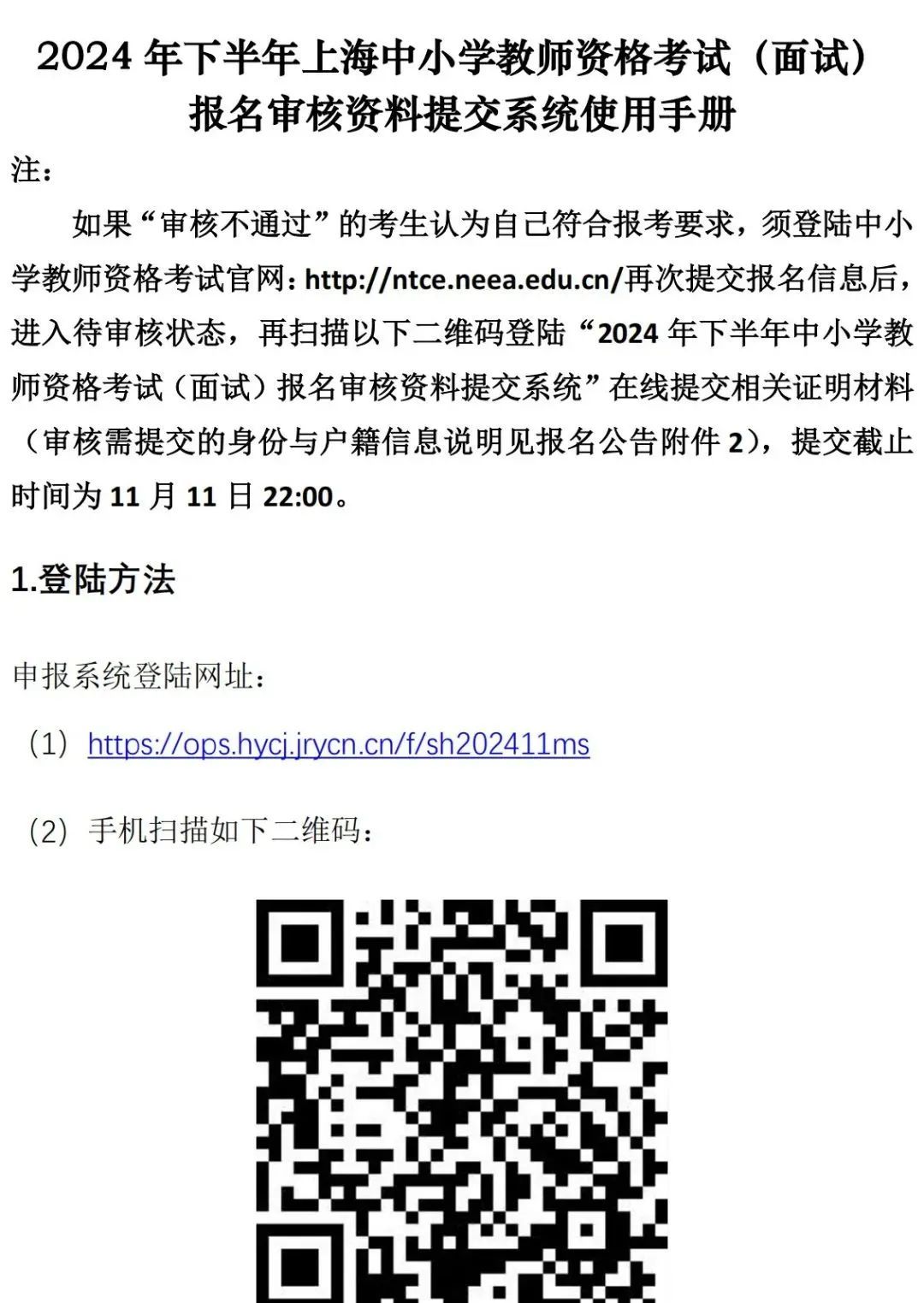 2.11月11日(星期一)9:00起考生自行登陆报名网站,若显示“审核通过”,表明考生符合报考条件通过了资格审核;若显示“审核不通过”,表明考生填报信息与市大数据中心查询的信息不一致,智能审核未通过。如果“审核不通过”的考生认为自己符合报考要求(如近期内已取得上海市居住证等),须登陆中小学教师资格考试官网:http://ntce.neea.edu.cn/再次提交报名信息后,进入待审核状态,再扫描以下二维码(或点击网址☞https://ops.hycj.jrycn.cn/f/sh202411ms)登陆“2024年下半年中小学教师资格考试(面试)报名审核资料提交系统”(系统使用手册见附件1)在线提交相关证明材料(审核需提交的身份与户籍信息、学历信息说明见附件2),提交截止时间为11月11日(星期一)22:00。