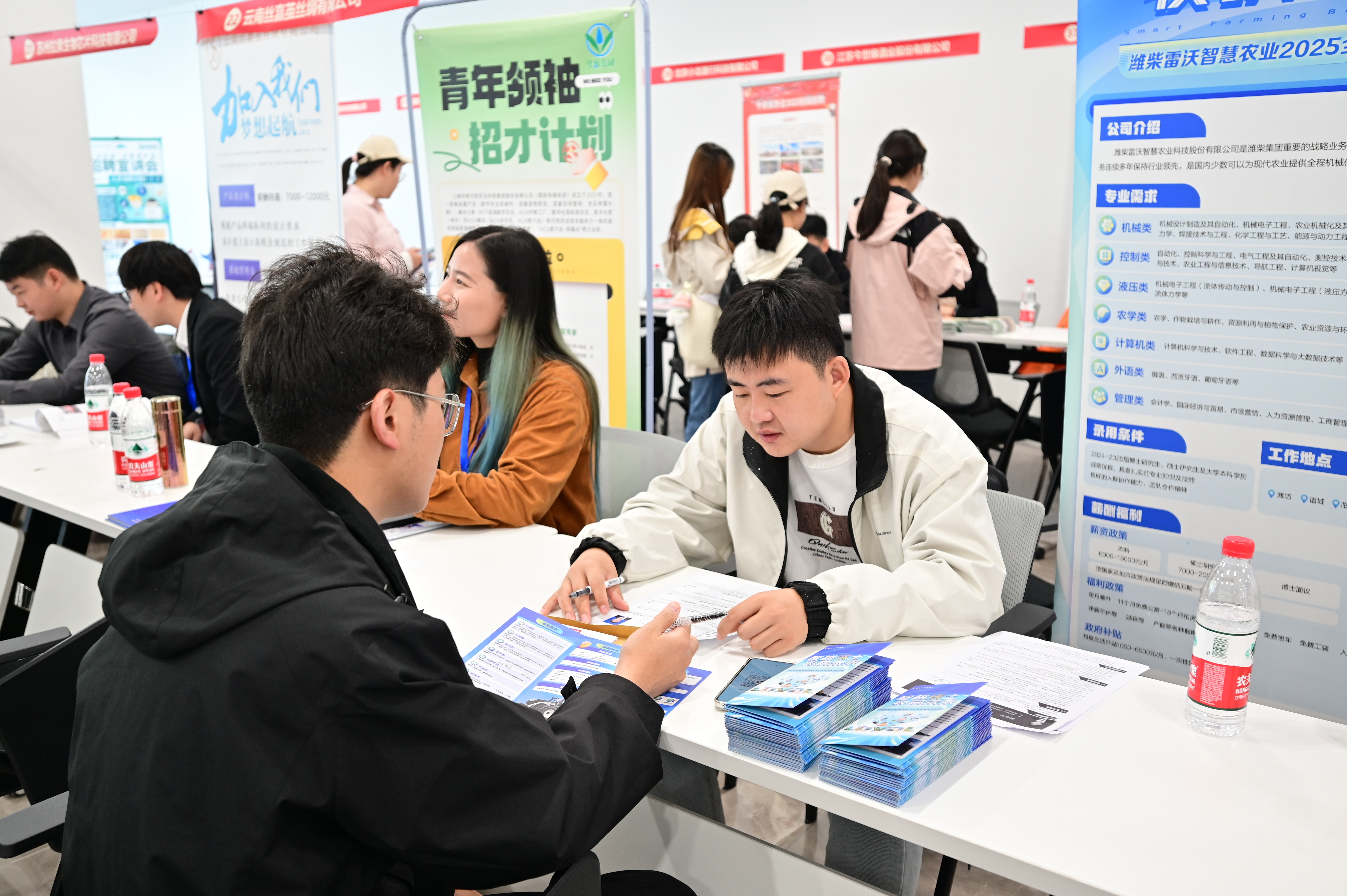 与此同时,11月3日上午,江苏农垦、潍柴雷沃、华智生物、优宁维、今世缘酒业等44家知名企业携500多个岗位亮相“‘十百千万’农业新质人才培养工程”南农校园招聘会。为2025届本硕博毕业生提供生物科技、机械制造、农业、人工智能等多个领域的就业选择。活动现场同学们与企业代表积极互动交流,一些企业当场与同学们达成录用意向。