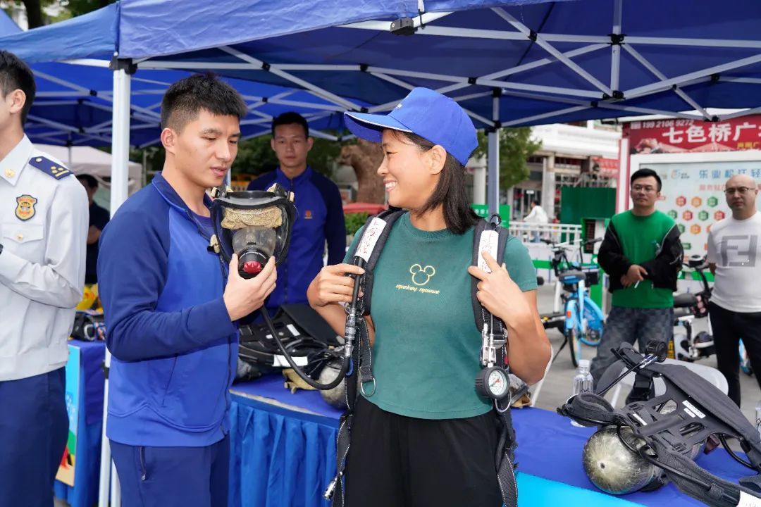 随后,一行人骑行到此行终点——位于文汇路樱花广场的“哈啰,蓝朋友”高校消防志愿者文创市集,领取明信片后开启了集章之旅。在集市现场,消防员们帮助大家穿戴体验空气呼吸器,讲解个中原理。
