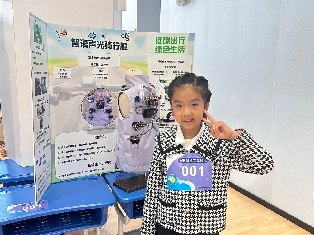 来自上海市民办桃李园实验学校的顾舒然同学是个骑行爱好者,她发现骑车转弯时有一定的安全风险,便以汽车转向灯为灵感,开发了一款自带转向灯的声控骑行背心。