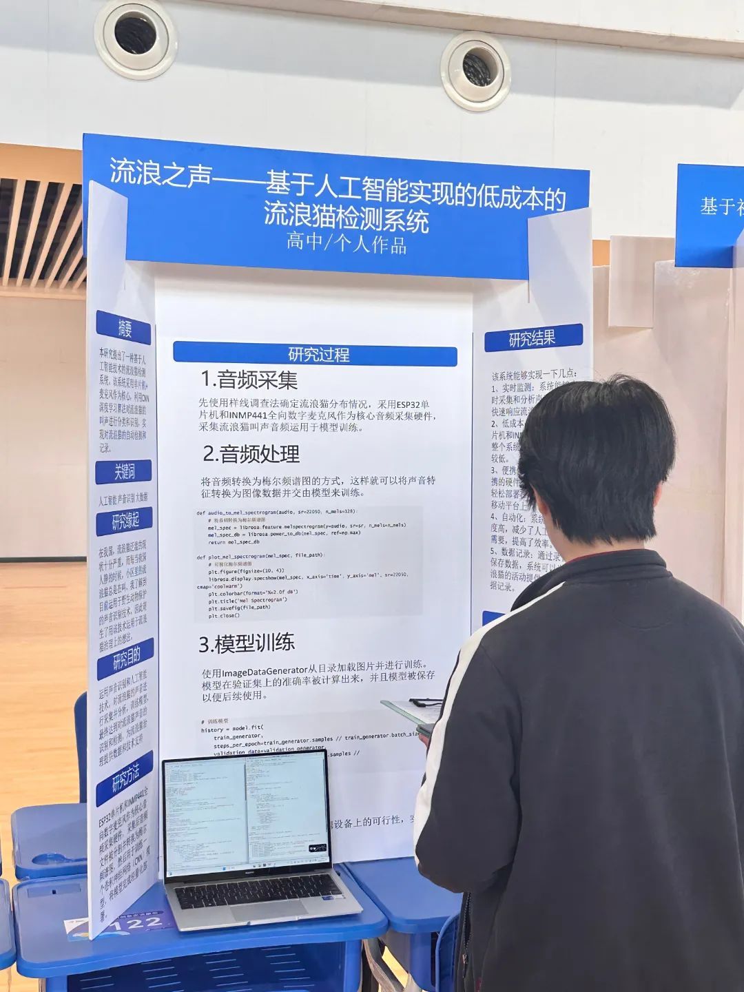 来自上海交通大学附属中学嘉定分校的邱程同学非常关心流浪猫的治理问题。她借助目前运用于野生动物保护的声音识别技术,设计了一款基于人工智能的流浪猫检测系统,可以帮助治理者掌握流浪猫的活动范围、数量乃至性别,从而采取适当的治理方式,比如为公猫做绝育手术、为幼猫寻求救助等。
