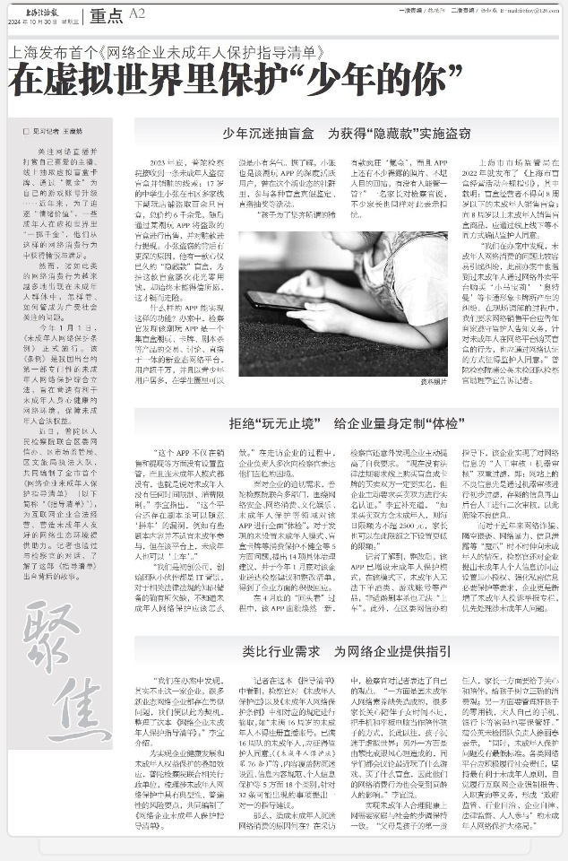 近日,普陀区人民检察院联合区委网信办、区市场监管局、区文旅局执法大队,共同编制了全市首个《网络企业未成年人保护指导清单》(以下简称“《指导清单》”),为互联网企业合法经营、营造未成年人友好的网络生态环境提供助力。记者也通过与检察官的对话,了解了这部《指导清单》出台背后的故事。