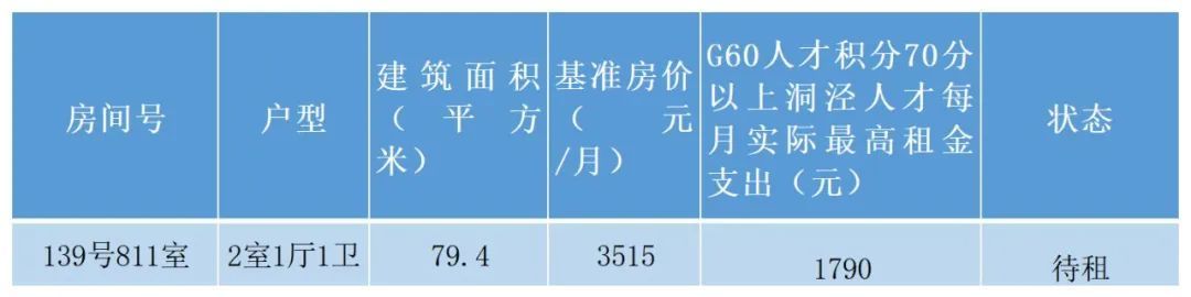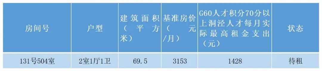 以公租房型人才房源为例:尚品雅筑二居室可在一定条件下合租,1号101室二居室建筑面积72.98平米,租金为每月3252元,如合租的2名洞泾人才G60人才积分均达到70分,则都可以享受每月1725元的租房补贴,那么他们就实现了“零成本”入住!(提示:补贴发放金额不超过实际租金!)