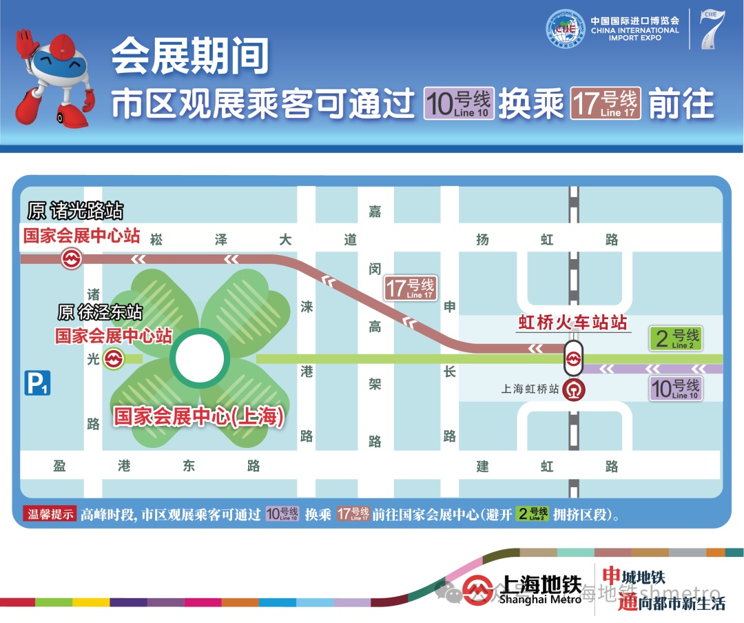 需要提醒乘客的是,原2号线徐泾东站、17号线诸光路站日前已更名为国家会展中心站,2号线国家会展中心站与17号线国家会展中心站虽然站名相同,同时这两座车站均可以到达国家会展中心,但这两站并非同一座车站也不能实现站内换乘,请乘客根据实际到达的场馆位置,选择就近站点下车,不要混淆。