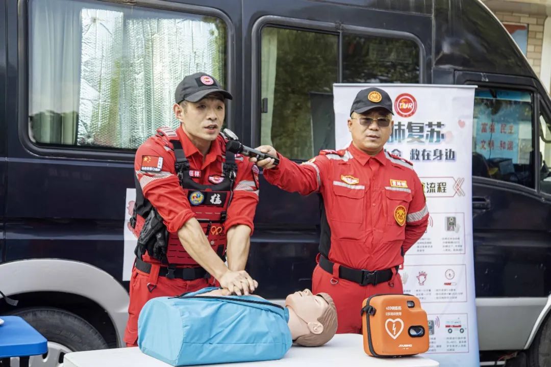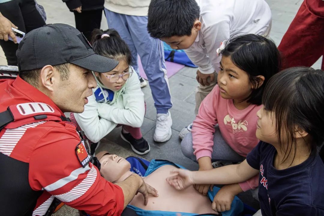 山锋应急救援队队员现场演示心肺复苏(CPR)操作和自动体外除颤仪(AED)的使用,孩子们饶有兴趣地练习了急救前的准备工作、了解如何急救:心肺按压与人工呼吸,动作及语言标准、整齐。大家纷纷对模拟人进行急救。通过积极、努力的实践,很快掌握了技巧。