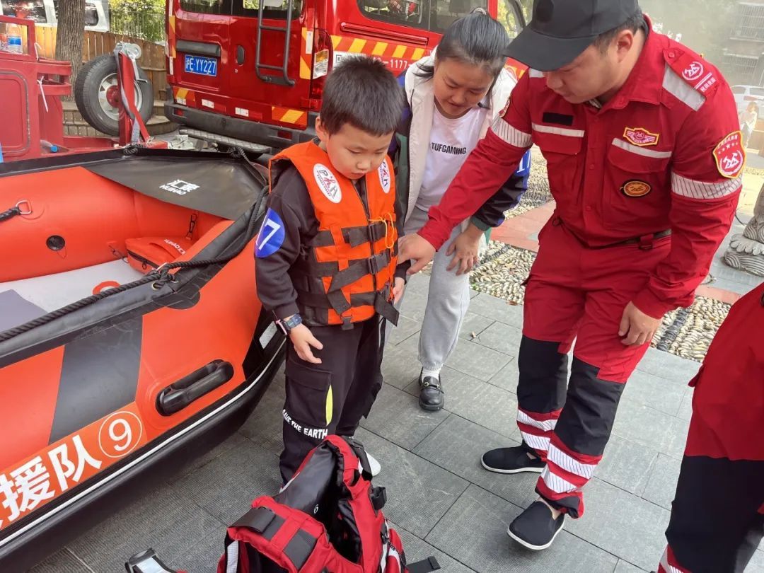 活动现场还展示了一些专业消防器材和应急救援器具:防毒面具、家用灭火器、皮划艇、救援车等,还教授了消防器材正确的使用方法。