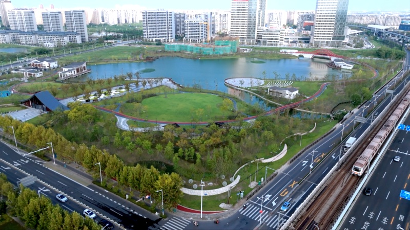 漫步公园,人工湖、景观桥、绿地以及文体活动设施相互交织。当阳光洒落,湖面波光粼粼,与周围的绿意、穿行的轨交7号线、拔地而起的现代建筑相映成趣,充满了生机与活力。
