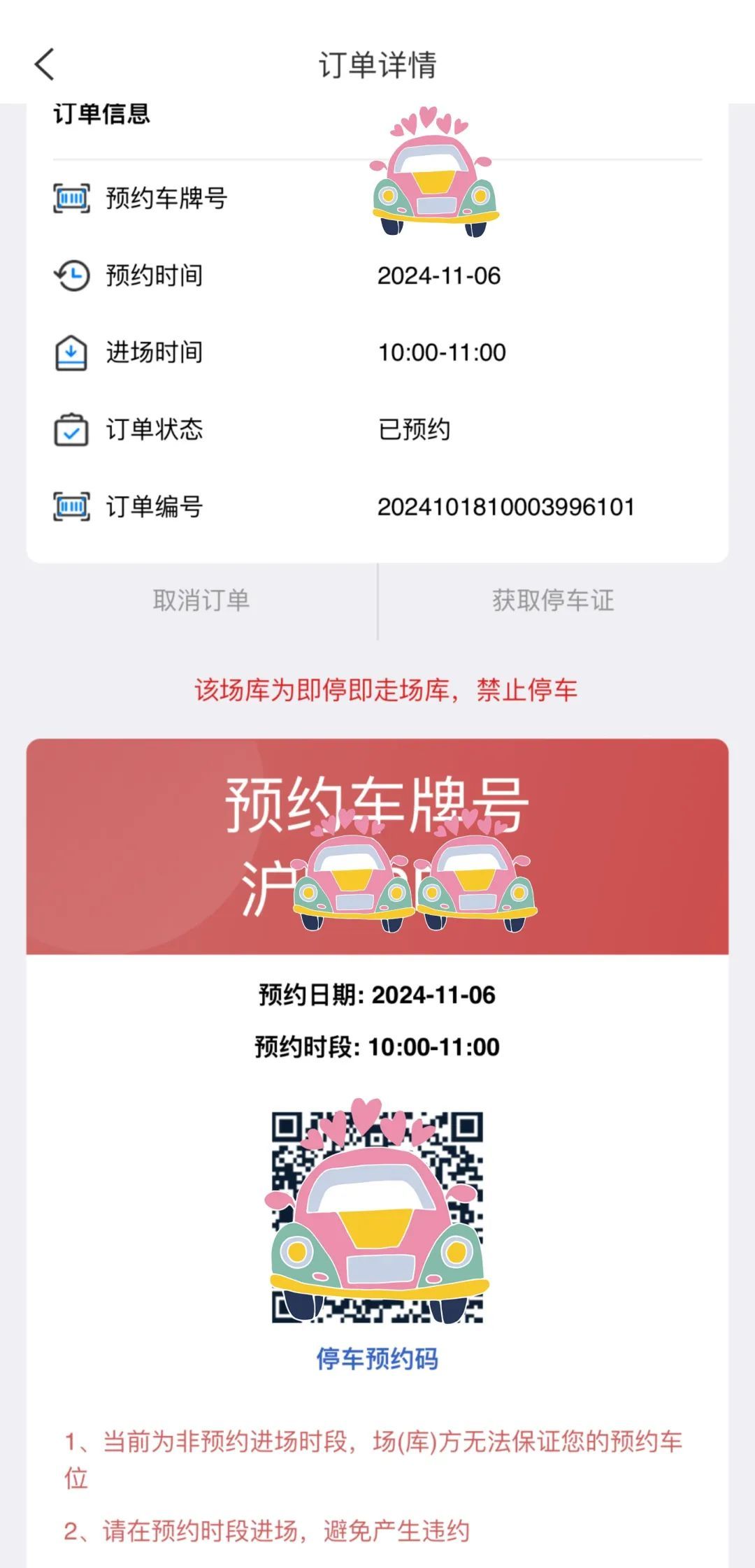 请注意,如果您预约的是凭证通行区的停车场,请提前下载打印好停车证,在预约的时间段内凭停车证入场停车↓